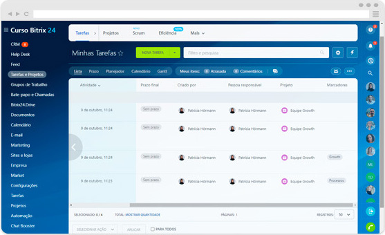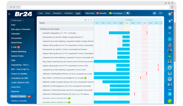 O Bitrix24 permite que você gerencie os projetos do seu time de forma organizada, utilizando quadros Kanban, cronogramas no modelo Gantt e definição de SLAs.